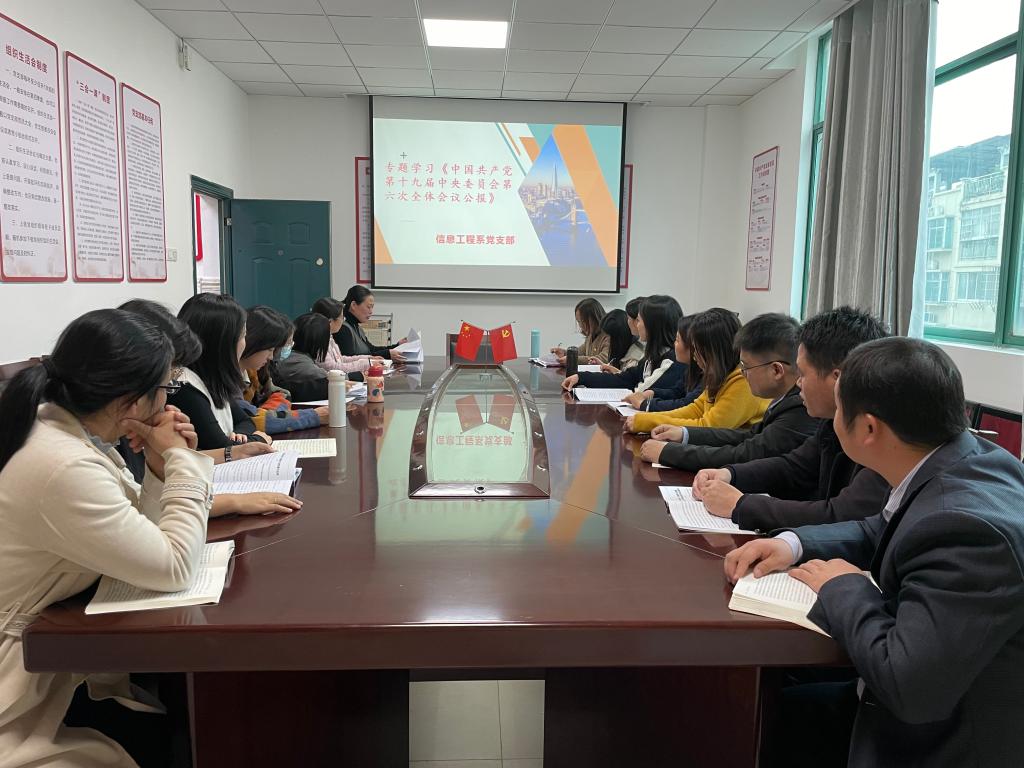 11月17日下午,信息工程系党支部组织全体党员在党员活动室开展了《中国共产党第十九届中央委员会第六次全体会议公报》专题学习会,会议由党支部书记主持。