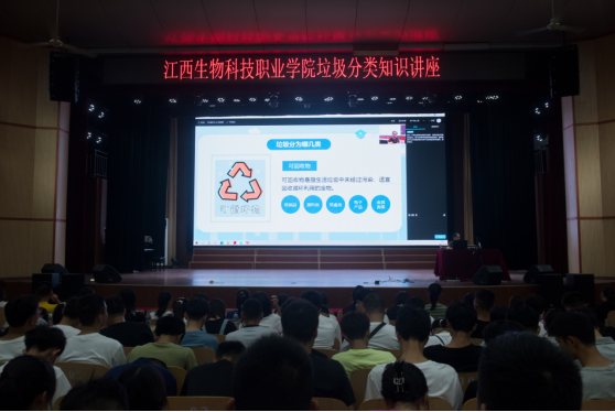 为进一步提升万象城官网新生绿色环保意识,切实增强垃圾分类观念,9月14日,万象城官网举办垃圾分类知识讲座。此次讲座由总务处副处长担任主讲,讲座主课堂设在大礼堂,分课堂设在各教室,学院2021级全体新生共计3000余人聆听讲座。