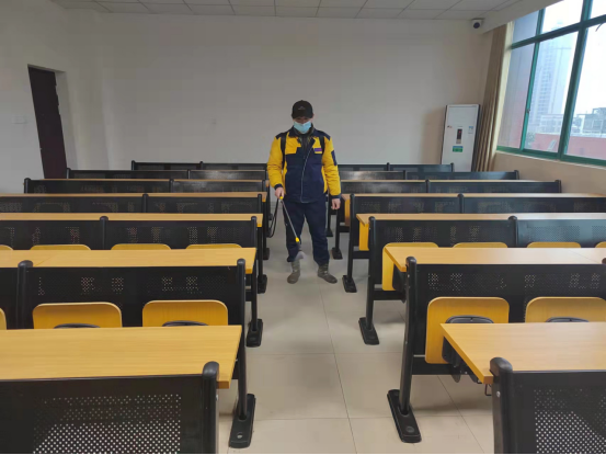 新学期,新气象!为广大师生创造卫生、整洁、健康、文明的校园环境全力以赴做好开学前的各项准备工作2月17,学院开展迎接新学期校园卫生大消杀活动