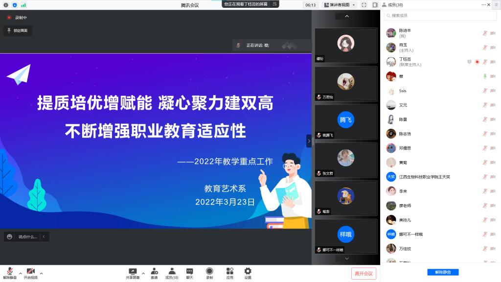 3月23日,教育艺术系第二次召开2022年教学重点工作学习及推进线上会议。本次会议由教育艺术系主任主持,全体教师参与了此次会议。