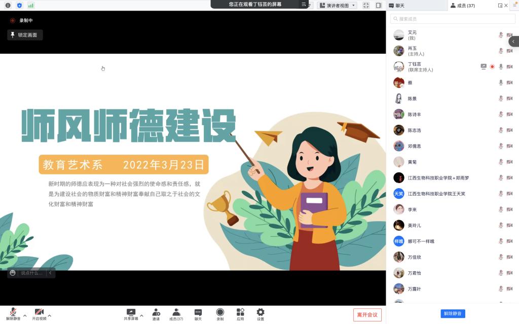 为深入落实立德树人根本任务,加强师德师风建设,3月23日,教育艺术系于线上开展师德师风专题学习活动。本次学习由教育艺术系主任主持,全体教师参与。