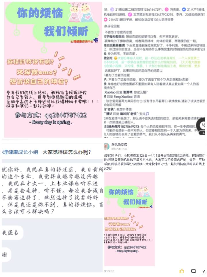 本次活动,心理健康咨询中心在公众号送上各类情绪困扰的处理方法,组织班级心理委员动员全体学生勇敢大胆表达自己的烦心事,积极主动开展缓解心理困惑的行动,鼓励学生对难以解决的心理困惑寻求学院心理健康咨询中心帮助。心理健康咨询中心采用线上解答、线下咨询的方式对学生的烦忧事进行耐心帮扶。