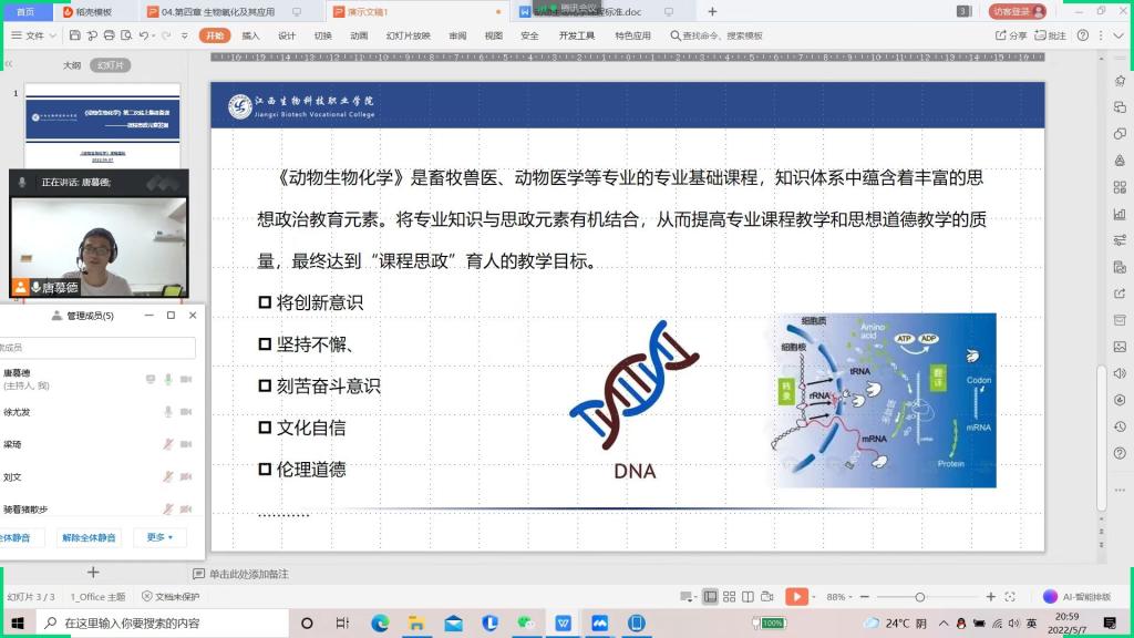 5月11日,动物科学系动科教研室开展本学期第二次线上集体备课活动,此次活动主要围绕《动物生物化学》课程思政元素的挖掘和讨论。