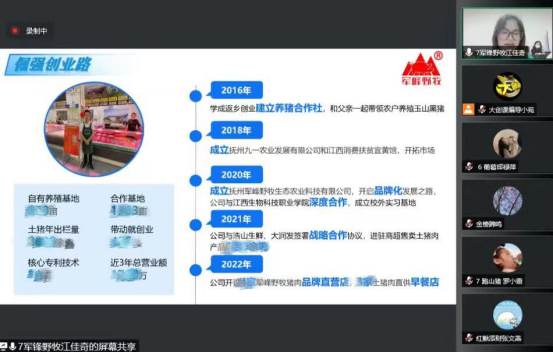 最后,学院“金榜蹄鸣”、“晋彪农牧”、“独菊匠心”、“灵芝红米”、“辣椒哥”、“葡之梦”、“军峰野牧”、“红鳅添财”、“爱回家”、“焊王”10个项目分别进行5分钟线上路演,艾卫平老师针对路演内容进行3分钟的项目问答,并针对项目中存在的问题开展细心指导,为各项目团队项目优化方向提供了明确的思路。经过激烈的PK,“军峰野牧”项目代表学院获得参加大创课省赛的宝贵名额。