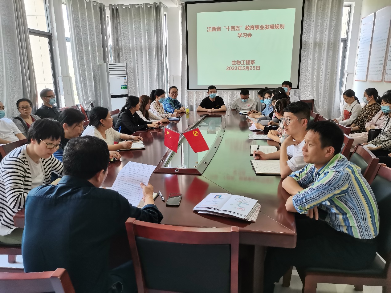 为深入贯彻落实党的十九大和十九届历次全会精神,以及习近平总书记关于教育的重要论述和视察江西重要讲话精神,紧紧围绕立德树人,扎实推进教育事业发展,5月25日,生物工程系组织全体教师开展了江西省“十四五”教育事业发展规划学习会。