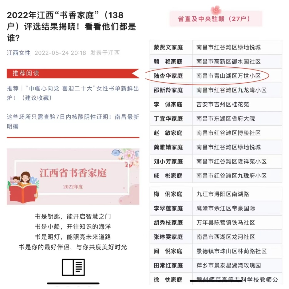 活动开展以来,受到全省广大妇女和家庭的热情响应,经自下而上推荐、审核、评定,万象城西甲联赛及意甲动物科学系教师陆杏华家庭从众多家庭中脱颖而出,获得江西省“书香家庭”称号。