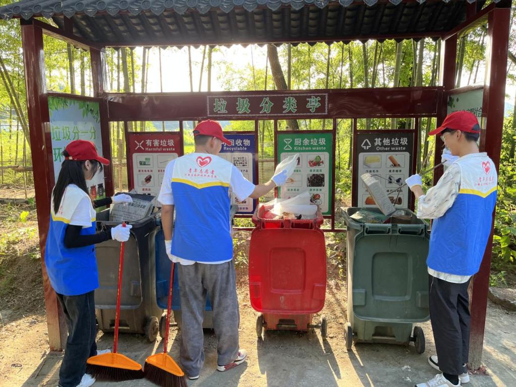 下午,团队成员们在村里开展街道清扫、整理杂物、垃圾分类等劳动,用自己自身行动将绿色环保理念带进乡村。
