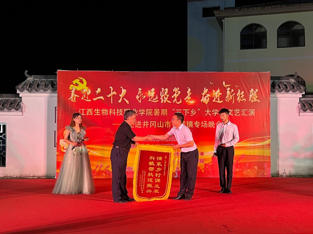 整场晚会取得圆满成功。晚会结束前,刘本标代表镇党委、政府向曹端荣赠送锦旗致谢,“情系乡村谋发展,科教帮扶促振兴”表达古城镇对学院倾情乡村振兴的感激之情,同时也是对农业农村厅驻村工作队工作的高度肯定和认可。