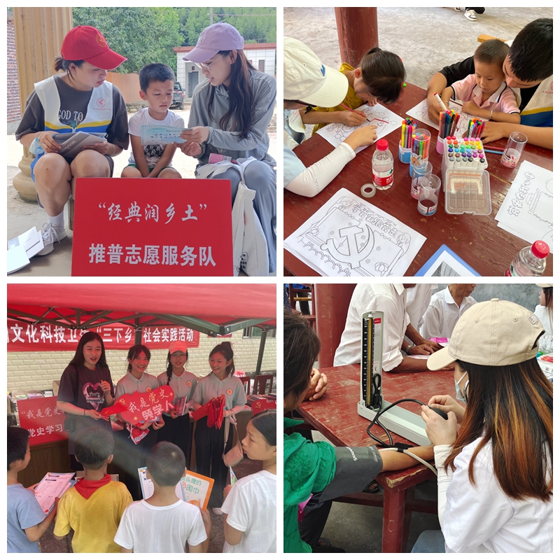 见面会结束后,志愿服务团来到长溪村,开展化肥、文具、图书、药品捐赠活动。随后各服务团在村委摆点设摊,科技支农团队为乡亲们提供免费小家电维修服务,给留守老人测量血压、血糖;推普宣传团队对过往村民推广普通话宣传,进行政策宣讲;党史实践团队开展上门入户进行探访慰问和问卷调查,寻访红军烈士遗属,了解长溪村红色历史和乡村现状。漫步在古城镇长溪村,随处可见志愿服务团队的红色旗帜飘扬风中,与村头巷尾的红色标识、红军雕塑、红色故事墙串联呼应、熠熠生辉,成为一道赏心悦目的“红色风景”。当晚学院暑期“三下乡”团队还为古城镇村民送去了精心编排的文艺演出晚会,收获了淳朴古城镇人民的欢声笑语和一致好评。