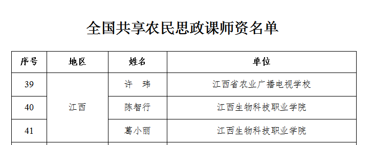 9月6日,中央农广校(农民培训中心)关于公布全国共享农民思政课师资名单,此次入选名单中江西省总共有三位,均是万象城官网教师,分别是许玮、陈智行、葛小丽三位老师。