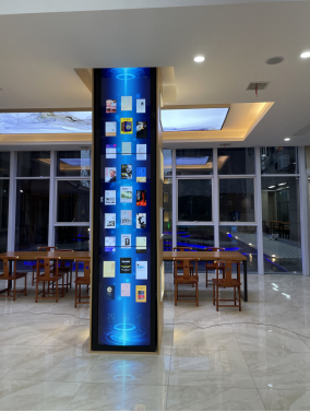 特色数字展示借阅系统由两条电子屏组成,屏高3.37米,宽约75公分,提供3000多本最近出版的畅销新书供师生借阅,且每天更新。读者可以通过微信扫一扫功能,把图书下载至微信收藏;或者通过学习通邀请码内的扫一扫功能,将书下载至学习通书架。特色数字展示借阅系统(瀑布流)同时还有400多集约100小时视频,汇聚名师讲坛和优质讲座,全年更新365场。同静态的电子借阅不同,瀑布流是让图书一帧帧流动起来,给读者不一样的惊艳的视觉体验。