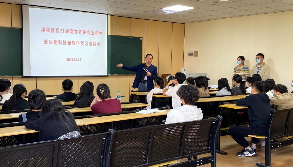 为做好2021级宠物养护与训导专业学生到生物科技园参加教学实践的工作,明确教学实践任务,确保此次教学实践有序、有效、安全的开展,10月16日,动科系在博学楼300教室召开了动员大会,系主任、学管干事、班级辅导员、相关任课老师和2021级宠物养护与训导专业学生参加会议。