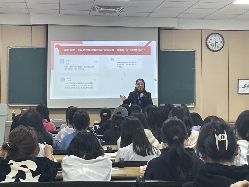听课小组一行人来到《习近平新时代中国特色社会主义思想概论》课堂分别推门听取了冷喜芬老师和李茹茵老师的授课。冷老师授课内容为《如何深化供给侧结构性改革》,围绕问题链化繁为简,由浅入深,注重调动学生的主观能动性,课堂气氛活跃。李茹茵老师授课内容为《如何坚持以人民为中心》,主要从坚持人民至上、紧紧依靠人民、不断造福人民、牢牢植根人民四个方面展开教学,一段段感人肺腑的故事讲述,令在场学生动容。