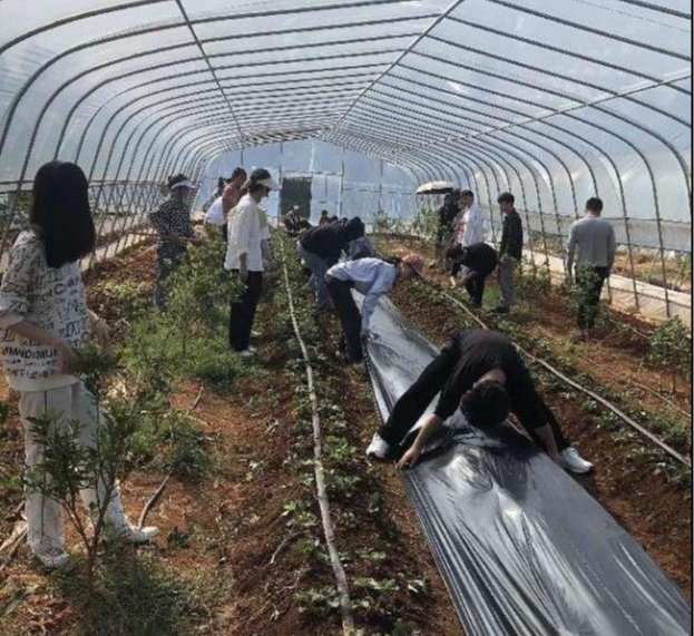 一个上午,同学们在两位老师的指导下,先后完成了对两个大棚内草莓的施肥、中耕锄草、培土、去老叶、覆膜、放苗、压膜及农药配制、喷洒防治病虫害等实践操作。因为天气炎热,大棚内的温度更高,同学们在实践操作过程中可谓挥汗如雨,但在老师的率先垂范下同学们的积极性很高,大部分同学很愉快的并保质保量的完成了各项实践操作任务。