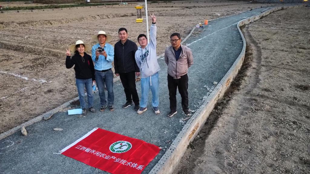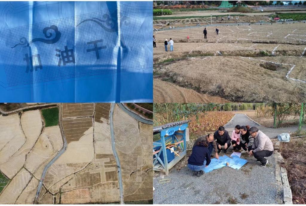 2022年9月-11月,我校的省休闲农业产业技术体系规划设计岗位专家团队根据体系工作安排,连续3个月在休闲农业综合试验推广站——上饶市德兴市楼上楼田园综合体主要负责打造“加油干”大型彩色油菜主题图案花海示范展示项目。专家团队成员多次前往试验站进行实地考察与测量,因地制宜规划花海主题图案并完成放线工作,将精心设计的主题图案从“纸上”落到“地上”。