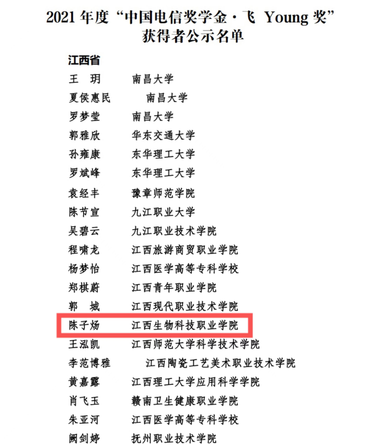 近日,由共青团中央、全国学联指导,中国电信集团有限公司、中国光华科技基金会联合举办的2021年度“中国电信奖学金”遴选结果正式揭晓。经校级、地市级分别推荐、省级初评和全国评审,万象城官网团委学生副书记、园林工程系2020级休闲农业1班陈子炀同学荣获2021年度“中国电信奖学金•飞young奖”。