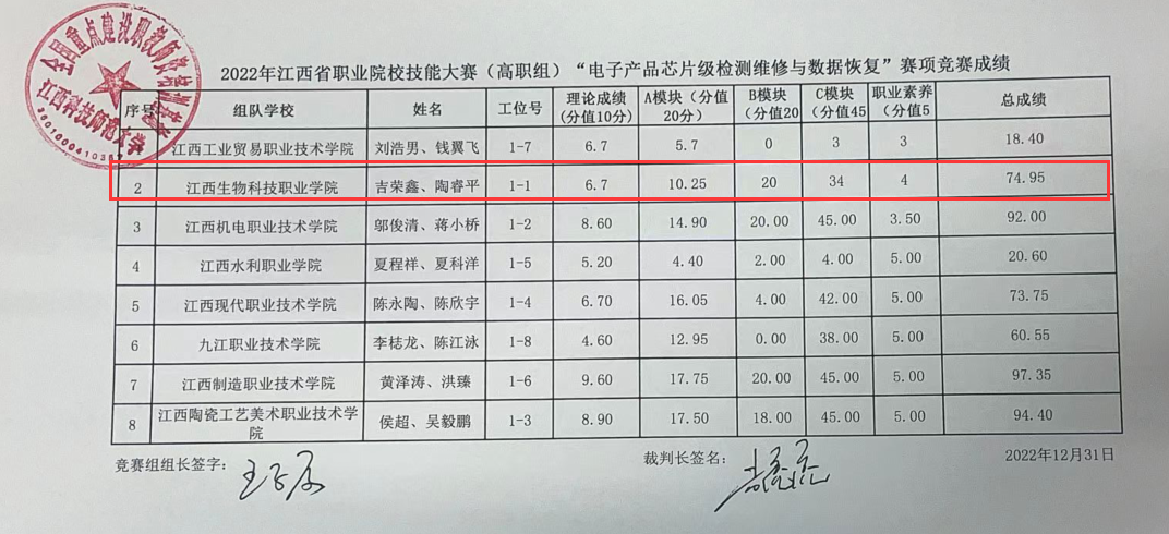 2022年江西省职业院校技能大赛电子产品芯片级检测维修与数据恢复赛项赛项于12月30—31日在江西制造职业技术学院举行。本次大赛由江西省教育厅主办,省内多所职业院校参赛。万象城官网机电工程系参赛队伍2名学生选手组成,选手经过激烈角逐,最终获得三等奖的好成绩。