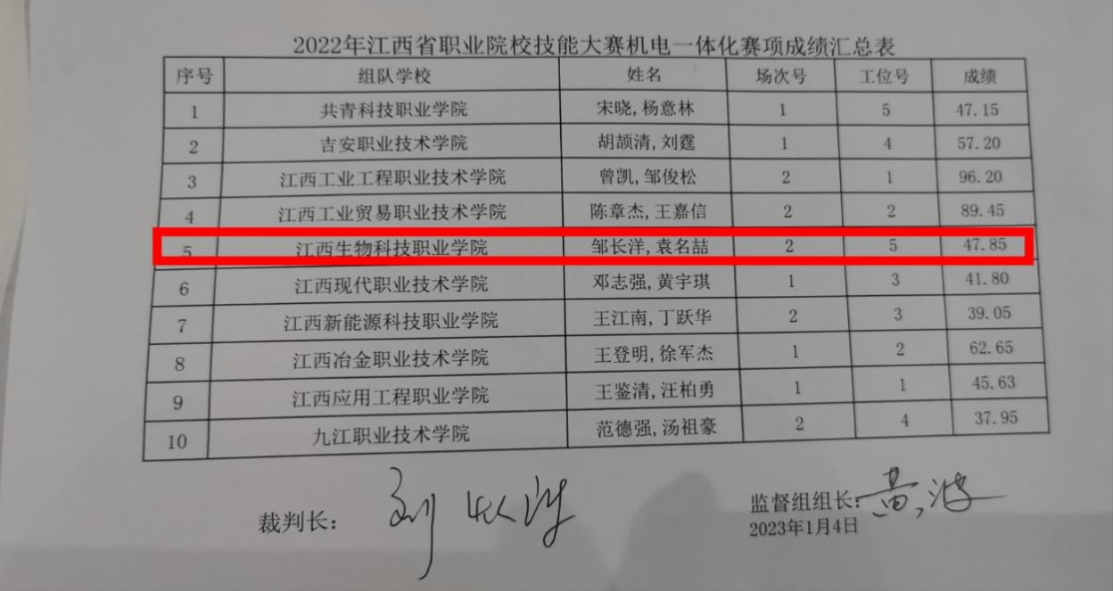 1月2日-4日,由江西省教育厅主办的2022年江西省职业院校技能大赛“机电一体化赛项”,在江西工业工程职业技术学院举行,省内多所职业院校参赛。万象城官网机电工程系参赛队伍由邹长洋、袁名喆2名学生选手组成,选手经过激烈角逐,最终获得三等奖的好成绩。