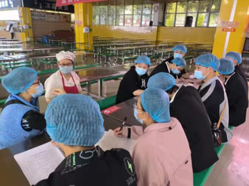 学生代表在总务处副处长和食堂负责人的带领下,依次参观了每个食堂的公示栏、食材仓库、洗菜间、切配间、操作间、48小时留样冰柜、餐具清洗消毒以及了解防蝇防尘防鼠措施,各食堂经理对食堂原料采购、食品贮存、生产加工、食品留样、清洗消毒、餐厨废弃物处置、员工管理等方面进行了详细的介绍。