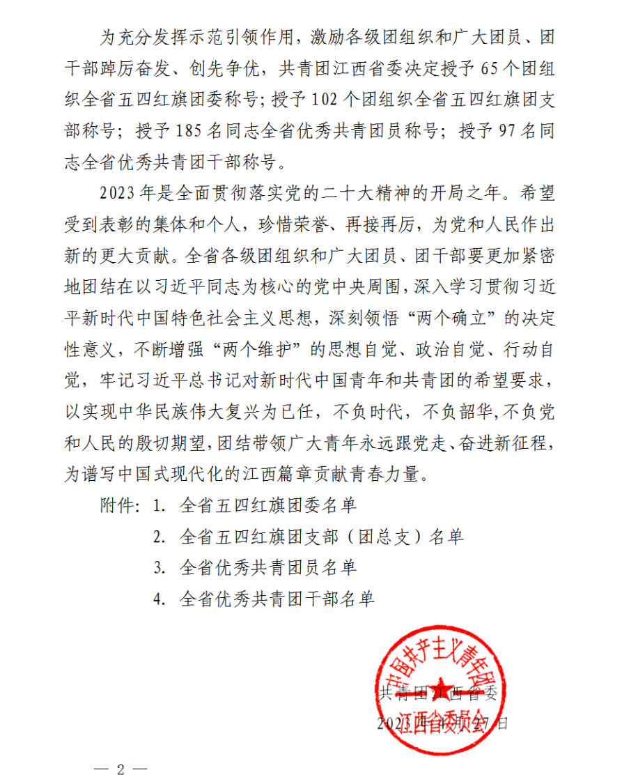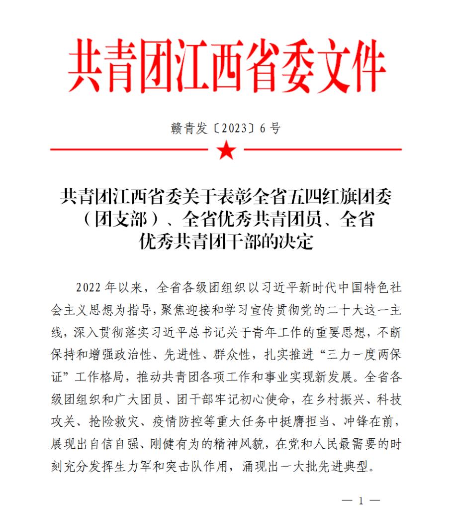据悉,全省优秀共青团员是共青团江西省委授予全省团员的最高荣誉。此次评选经过个人申报、系团总支推荐、院团委评选、院党委审议通过、公示无异议等环节后上报团省委,严格落实参评资格和评选条件,坚持从严审核、优中选优,具有广泛的代表性。