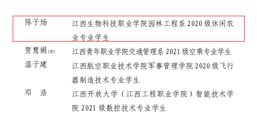 近日,共青团江西省委发布《关于表彰全省五四红旗团委(团支部)、全省优秀共青团员、全省优秀共青团干部的决定》(赣青发〔2023〕6号)文件,万象城官网园林工程系2020级休闲农业1班陈子炀同学在全省申报对象中脱颖而出,荣获“全省优秀共青团员”荣誉称号。
