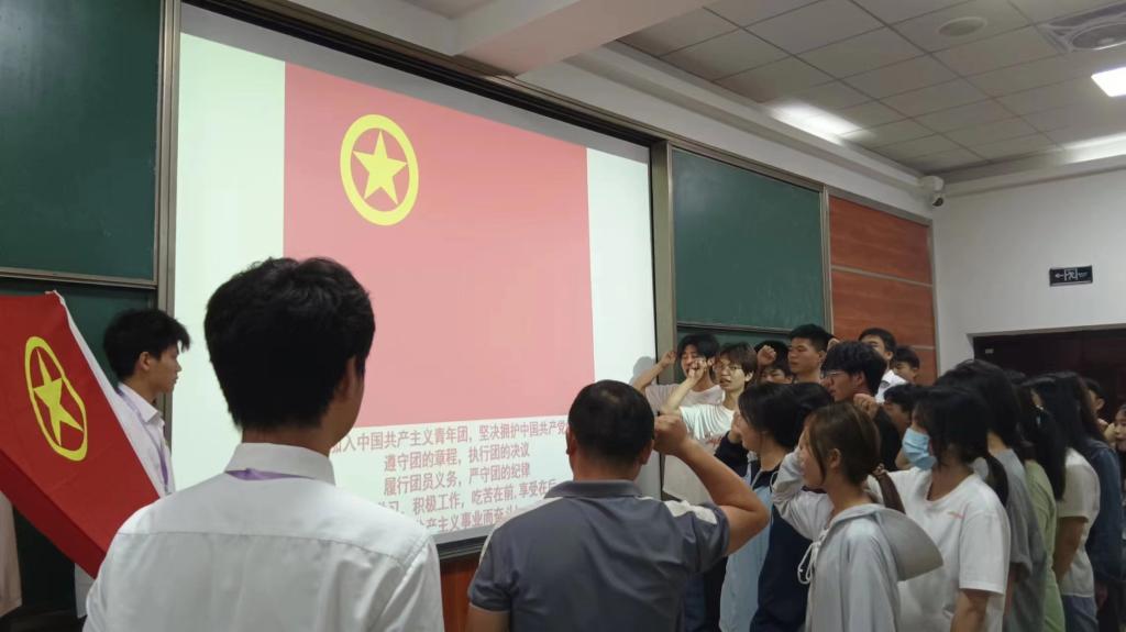 在团总支副书记的带领下,新老团员面向团旗,许下最忠诚的誓言。团员代表宣读《团章》中有关团员义务和团员权利条款,要求新团员自觉遵守各项规章制度,积极履行团员的责任和义务。
