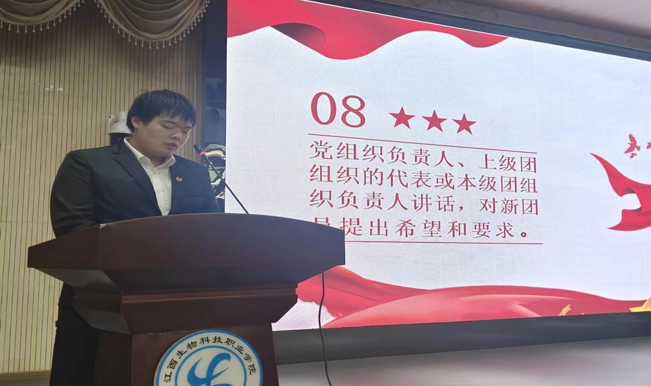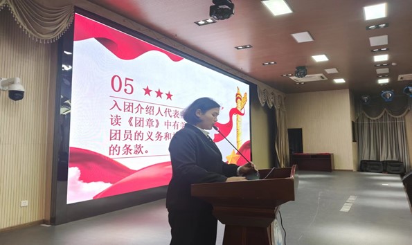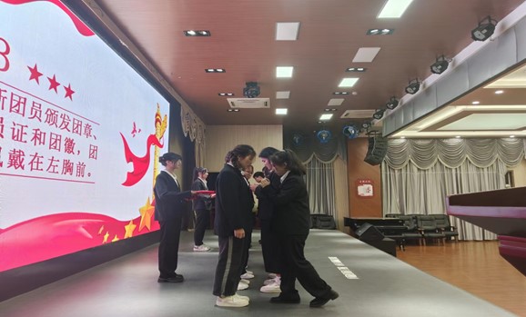 仪式开始全体起立高唱国歌,主持人宣读新团员名单;随后依序进行团章、团员证和团徽颁发,新团员的宣誓,入团介绍人代表宣读《团章》中有关团员的义务、权利的条款和新老团员代表发言等流程。一枚枚鲜艳的团徽在新团员的左胸口熠熠生辉,时刻提醒着他们时刻牢记自己的团员身份,发挥共青团员的先锋模范作用;铿锵有力的誓词表达了团员们对共青团组织的无限向往和豪迈激情。