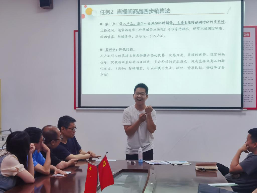 本次公开课是由罗康明带来的《直播电商》课程中的教学片段——直播话术设计。罗老师课前充分备课,认真研读教材,采用示范教学的方式,将直播搬到了现场,在整个教学过程中,罗老师亲切、自然,循循善诱,语言有感染力,获得了老师们的阵阵好评。随后,大家共同听取了罗老师的课程设计思路、教学意图,并纷纷表达了自己的看法和建议,意见中肯,气氛热烈。