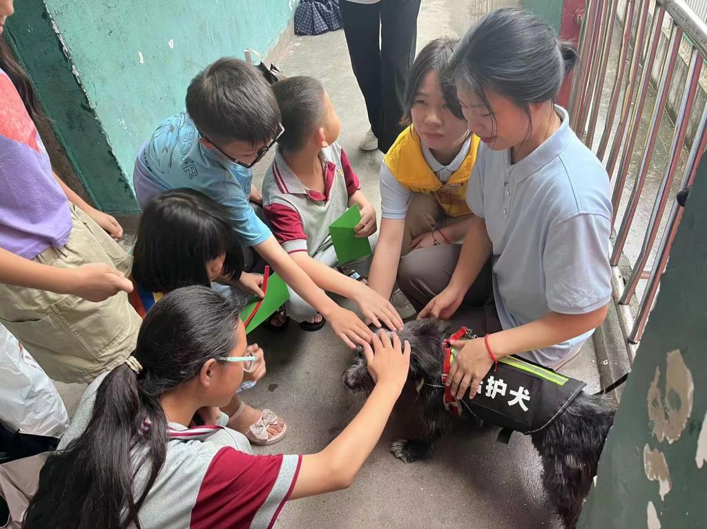 为了进一步打开性格内向孩子的心扉,志愿者们将宠物陪护犬“二黑”介绍给了孩子们。首先带队老师给孩子们讲述了宠物犬的相关知识,并指导志愿者们带领孩子和陪护犬进行玩耍,一开始有些孩子有些只敢在旁边观察,在志愿者们的引导下、在二黑的陪伴下那些胆小的慢热、腼腆、内向的孩子也迈出了第一步,有勇气去触摸二黑,互动慢慢也多了起来,并脑洞大开的问了志愿者们许多关于宠物的有趣问题,教室里面欢声笑语笑声不断。接着,带队老师为该校师生讲述了宠物在心理陪护方面的知识,并进行了防诈骗、防溺水等方面的宣讲。活动结束后,该校师生对志愿者们表示感谢,同时赞叹道,宠物在陪护尤其是对心理内向、性格孤僻的孩子方面有着如此积极作用,欢迎志愿者们常来学校开展相关活动。