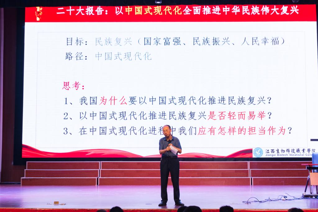 质管办主任陈智行教授讲述了《中国式现代华与青年的担当作为》专题,坚持以问题为导向,从“为什么以中国式现代化推进民族复兴?”、“以中国式现代化推进民族复兴是否轻而易举?”、“推进中国式现代化哪些方面不可或缺?”3个问题入手,全方位地讲述了青年要勇担民族复兴大任,立志做有理想、敢当的、能吃苦的、肯奋斗的时代新人。