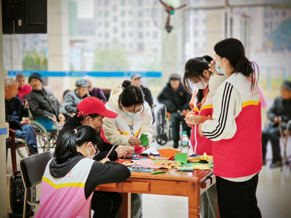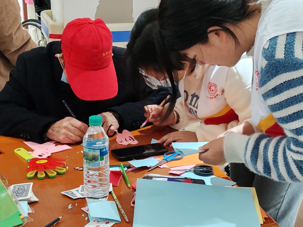 下午3点,志愿者们迎着绵绵细雨敲响了敬老院的大门,他们为老人精心准备了小游戏和剪纸,热情与老人互动;附身倾听老一辈的故事,勾起了爷爷奶奶心中那些青涩美好的回忆;年轻一代与老一辈的对弈,既是志愿者对老人的默默陪伴,也是老人对志愿者的亲切指导。老人们开心满足的笑容,让志愿者们感受到了志愿服务的奉献价值。