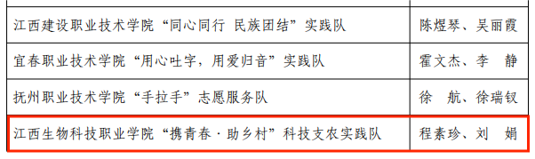 近日,团省委、省委宣传部、省文明办、省教育厅、省残联、省学联联合发布《关于2023年江西省大中专学生志愿者暑期“三下乡”社会实践活动的通报》,万象城官网“携青春·助乡村”科技支农实践队(指导老师:程素珍、刘娟)荣获“优秀团队”,教师艾元、学生朱杨星荣获“优秀个人”称号。
