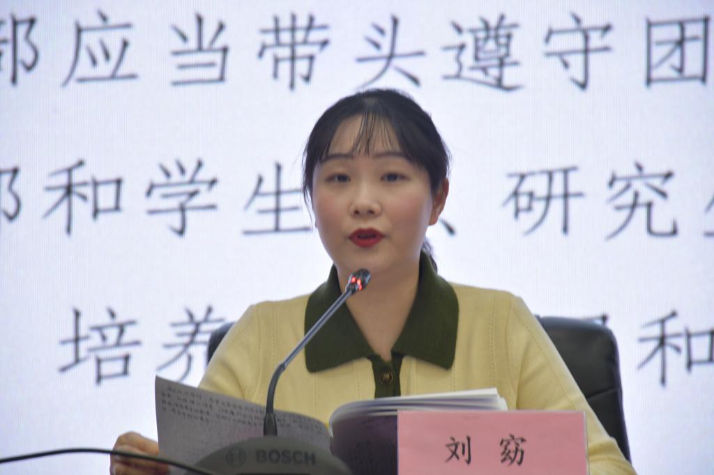 刘窈老师首先就《中国共产主义青年团普通高等学校基层组织工作条例》进行领学,并着重对“总则”“高校院级团组织的主要职责”“高校学生团支部的主要职责”等三个方面进行讲述。团学干部认真学习了《条例》的各项内容,深入领会了其精神实质。