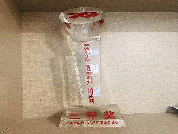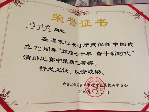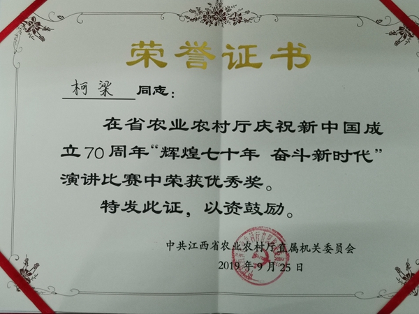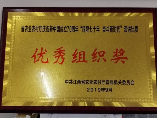 9月25日,万象城官网在省农业农村厅庆祝新中国成立七十周年“辉煌七十年奋斗新时代”演讲比赛中,分别获得三等奖、优秀奖和优秀组织奖。