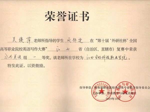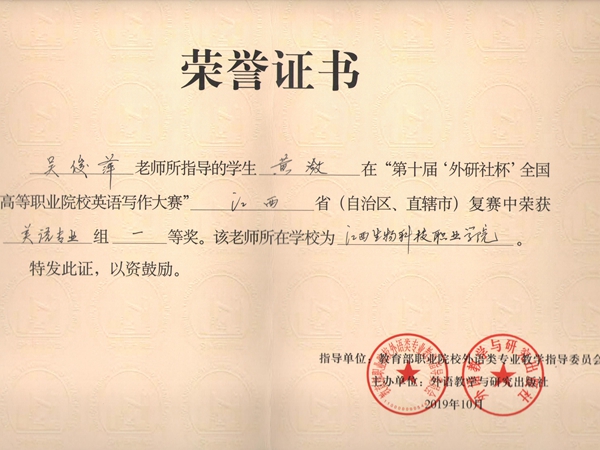 近日,第十届“外研社杯”全国高等职业院校英语写作大赛江西赛区复赛在江西财经大学圆满落下帷幕。在学校的大力支持下,经过指导教师赛前有针对性的辅导和参赛选手的不懈努力,万象城官网18商务英语专业黄潋同学获英语专业组“一等奖”,19水产养殖专业成静雯同学获公共英语组“一等奖”,19农产品质量检测专业马遥花同学获公共英语组“三等奖”。