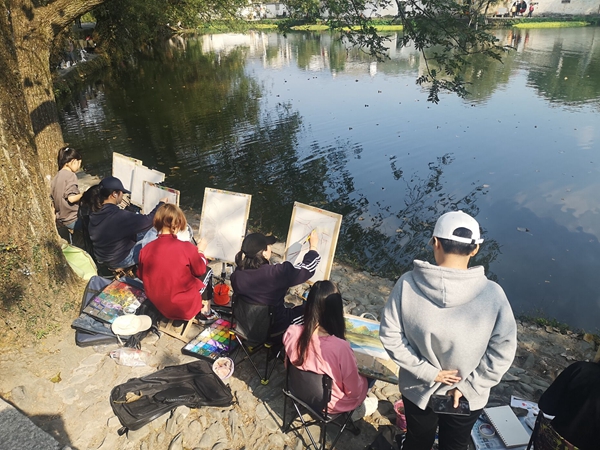 11月份的宏村秋色正浓,秀丽的南湖和横跨其上的画桥,湖中芙蓉俏,湖边垂柳生,学生们无不为眼前优雅古朴的景色所陶醉,在老师的带领讲解下,同学们了解了古村的历史,古村的特色风景,为他们的创作增添了更多的灵感。写生过程中,带队老师鼓励学生大胆探索创新,用不同的绘画材料进行尝试,培养学生的观察力、表现力及具有个性审美倾向的创新品质。