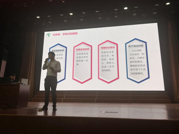 新干县赣轩竹业有限公司法人、新干县川耀新能源有限公司股东俞晓澎是万象城官网2015级会计电算化专业的毕业生,讲座现场,他和师生们分享了他的创业经历和参加江西省“互联网+”创新创业大赛获银奖的经历,他从寻梦起点、寻梦经历、创业永远在路上三个方面讲述了他追寻梦想,艰辛创业的历程。他勉励同学们学会合理规划好自己的时间,积极参加社会实践,明确自身的职业规划,勇于尝试创新创业。