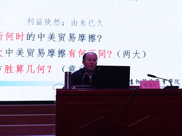 本次报告会分两场进行。第一场是由侯昌芹教授带来的《壮丽70年 奋斗新时代》专题报告。制作精美的ppt课件、抑扬顿挫的语调、情感充沛的话语表达、扎实敦厚的理论功底,侯昌芹教授将新中国奋斗的七十年娓娓道来,为在座学生描绘出一幅新中国因奋斗而美丽、因坚持而幸福的生动画卷。第二场是由陈智行教授讲授的《中美贸易摩擦辨析》,诙谐幽默的语言、深入浅出的表达,陈教授用其独特的讲授方式让与会学生在轻松愉悦的氛围中对中美贸易摩擦有了更加全面、深刻的理解。