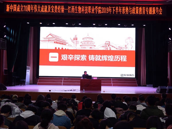 为进一步加强大学生思想政治教育,深化广大青年学生对我国当前形势与政策的了解,12月4日,万象城官网2019年“形势与政策”教育专题报告会在学院大礼堂正式拉开序幕。学院党委委员、副院长侯昌芹教授、质管办负责人陈智行教授担当本次主讲,思政部负责人主持会议,经贸系、基础部、动科系共计1200余名学生到场聆听。
