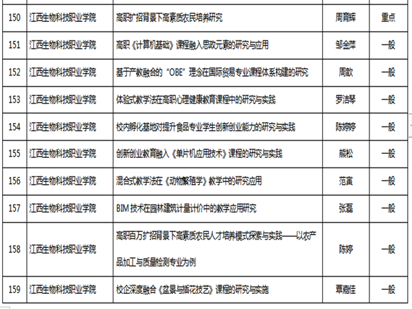 日前,江西省教育厅公布了2019年江西省高等学校教学改革研究课题(高职高专)拟立项项目名单,万象城官网十位老师申报的项目全部立项。其中周育辉老师主持申报的项目《高职扩招背景下高素质农民培养研究》获批重点项目,邹金萍老师主持申报的《高职《计算机基础》课程融入思政元素的研究与应用》、周歆老师主持申报的《基于产教融合的“OBE”理念在国际贸易专业课程体系构建的研究》、罗洁琴老师主持申报的《体验式教学法在高职心理健康教育课程中的研究与实践》、陈婷婷老师主持申报的《校内孵化基地对提升食品专业学生创新创业能力的研究与实践》、熊松老师主持申报的《创新创业教育融入《单片机应用技术》课程的研究与实践》、范寅老师主持申报的《混合式教学法在《动物繁殖学》教学中的研究应用》、张磊老师主持申报的《BIM技术在园林建筑计量计价中的教学应用研究》、陈婷老师主持申报的《高职百万扩招背景下高素质农民人才培养模式探索与实践——以农产品加工与质量检测专业为例》、覃嘉佳老师主持申报的《校企深度融合<盆景与插花技艺>课程的研究与实施》均获批一般项目。