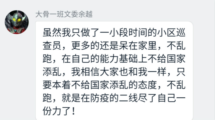 分享会上,11名同学发言,他们大都参与了防疫志愿者服务。他们给大家分享了在抗击疫情战斗中,自己是如何发挥自身的作用在乡政府防疫工作以及家庭防疫中所作的贡献。有的同学在其家人极度不理解自己的抗疫志愿行动,并对本次疫情也持无所谓态度的情况下,还是耐心地从网上找出新闻报道来为家人及周围群众讲解本次疫情防护工作的重要性,并尽己所能为全社区群众宣传此次疫情防护小常识。疫情发生后,许多同学作为青年防疫志愿者,陆续投入到家乡的信息登记、交通执勤、物资发放、车辆登记、入户调查和社区消杀等防疫相关工作中,为家乡抗击疫情尽了一份微薄之力。分享会上,同学们纷纷表示,我们90后、00后不是垮掉的一代,我们是祖国的希望,我们要把个人价值实现在党和人民最需要的地方;在新冠肺炎疫情防控中,大家发挥志愿精神和专业特长,身体力行,在社区、乡村,线上、线下,竭尽所能为疫情防控贡献力量,相信在不久后我们一定能取得战斗的胜利!