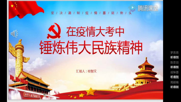 课后,同学们纷纷表示,在这场没有硝烟的战争中,凝聚力量,坚定信心,在抗“疫”期间主动强化责任担当,在言行上以身作则,比如在疫情期间,要积极主动配合完成“健康打卡”的每日上报工作; 在线上教学期间,做到不迟到不早退,认真上好网课,提升自我;满怀真诚之心,全心全意为同学服务。(文/桂智文)