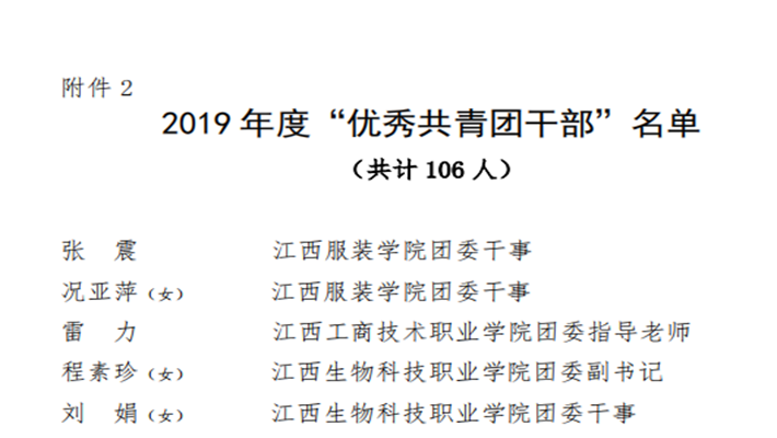 近日,江西省职业院校共青团工作协会下发了《关于表彰江西省职业院校共青团协会2019年度 “优秀共青团员”“优秀共青团干部” “五四红旗团委 ”“五四红旗团支部(团总支)”的决定》的通知。万象城官网动物科学系团总支、经济贸易系团总支、信息工程系团总支荣获江西省职业院校共青团协会2019年度“团协五四红旗团支部(团总支)”称号,程素珍、刘娟荣获江西省职业院校共青团协会2019年度“团协优秀共青团干部”称号,罗丹、王胜安同学荣获江西省职业院校共青团协会2019年度“团协优秀共青团员”称号。(文/刘娟)