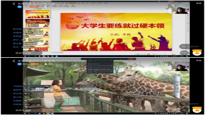团委副书记结合当前新冠肺炎疫情特殊时期,就大学生为什么要练就过硬本领、怎样练就过硬本领和练就哪些过硬本领三个方面,阐述了在这个特殊时期宅在家的大学生群体,要脚踏实地,从现在做起,从自我做起,以切实的行动认真学习专业知识和技能,提高自身素养,练就建设祖国、报效人民的过硬本领。讲座开始,她从习总书记在五四运动一百年之际对广大青年提出的新时代中国青年要练就过硬本领引入主题,并结合"两个一百年”奋斗目标和新时代要求,阐述了大学生为什么生要练就过硬本领从练就过硬本领,要有报效国家的情怀、要有时不我待的紧迫感、要有投身基层的实干精神等三方面讲解了大学生怎样练就过硬本领;从大学生要掌握现代科学文化知识和做好知识储备、积极投身实践、学以致用,将书本知识与基层经验结合起来,将扎实的学问和厚实的见识结合起来,将理论学习与实践探索结合起来,既扎实打牢基础知识又及时更新知识,既刻苦钻研理论又积极掌握技能等方面讲解了大学生要练就哪些过硬本领。讲座中,她不时穿插相应短视频进行分析和讲解,并不时鼓励同学们:无奋斗,不青春!选择吃苦也就选择了收获,选择奉献也就选择了高尚!与同学们产生诸多共鸣。