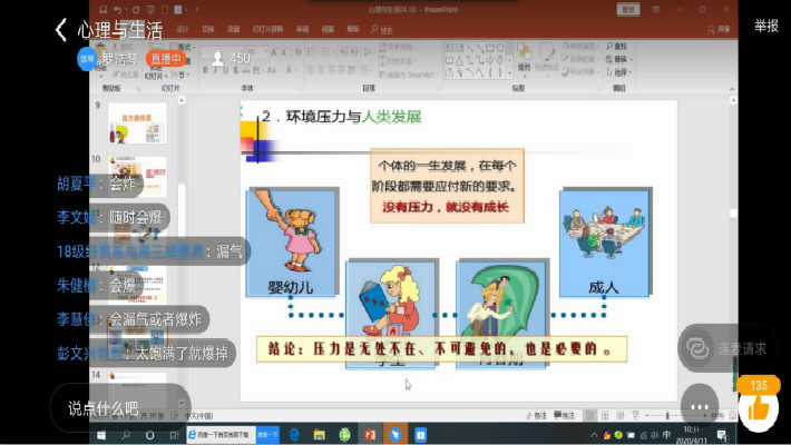 万象城官网心理咨询师针对“压力”、“焦虑”、“迷茫”三个方面提出了“了解自己、悦纳自己”的解决方法。对当前特殊时期在家的学生群体存在的心理现状、问题以及对学习的影响、对生活的影响等方面作了独到的分析,就当下实际学习、生活中如何妥善排解压力、调节情绪、保持积极健康的心态及学会与压力共舞作了详细的阐述。并向学员们提出了三点建议:一是将自己大部分的精力投入到自己擅长的事情上,增强自己的优势、提高自己的自信;二是当出现负面情绪时积极向朋友倾诉,寻求家人、同学及老师们的帮助,积极面对,用行动挣脱负面情绪;三是提高自我效能,获得控制感。
