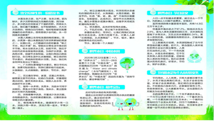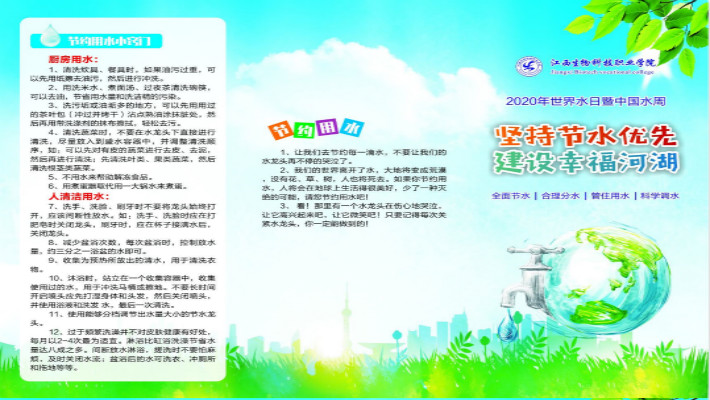 3月22日是第二十八届“世界水日”,也是第三十三届“中国水周”的首日,今年我国的宣传主题是“坚持节水优先,建设幸福河湖”。为持续推行节水观念,营造节水型文明校园文化氛围,学院展开了系列节水宣传活动。