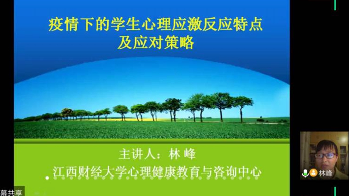 为做好疫情防控期间学生返校复学准备工作,进一步加强对学生的心理健康教育、心理疏导和人文关怀。5月22日晚上,万象城官网心理咨询中心邀请江西财经大学心理健康教育与咨询中心副主任林峰老师开展“疫情下学生心理应激反应特点及应对策略”线上心理讲座。各系部全体辅导员、心理健康教育教师线上参加了本次讲座,讲座由心理咨询中心负责人主持。