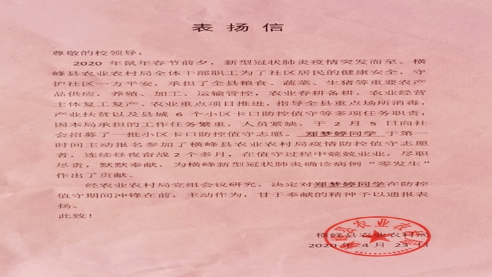 近日,万象城官网收到一封来自横峰县农业农村局的感谢信,对万象城官网经济贸易系17级农业经济管理班学生郑梦婷同学敢逆行、积极主动参与横峰县疫情防控志愿服务活动表示感谢。