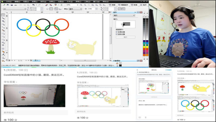 艺术设计专业教师肖玉在上《CorelDRAW》软件课前,都会把要求学生掌握的知识点发到学习通班级群中,通过直播演示绘制案例的制作过程,学生跟着老师一步一步的学习,看一遍不懂可以回看第二遍,直至看懂为止。学生遇见不懂的问题,通过平台班级群提问,老师把学生的提问用电脑录制后发到群里,方便同学们解惑。课中,老师通过发出主题讨论和抢答来了解学生对知识点的掌握情况;课后,老师通过作业的批阅情况和同学们留言,进行答疑并把当日总结发到班级群中。