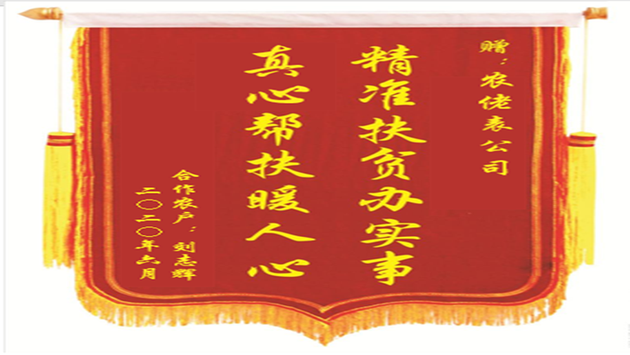 “精准扶贫办实事,真心帮扶暖人心”这是江西石城县小松镇的刘志辉送来的一面锦旗,语言质朴但充满真情实感,表达了对农佬表团队和创始人温斌的感激之情,也是对农佬表团队在扶贫助农工作的最大肯定和鼓舞。